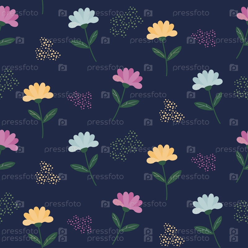 Бесшовный узор с разноцветными цветами и точками на синем фоне