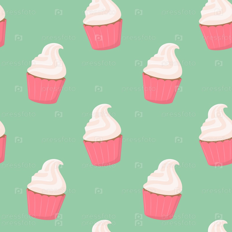 Бесшовный узор из сладких вкусных кексов со сливками на светло-зеленом фоне. Векторная иллюстрация десерта в плоском стиле