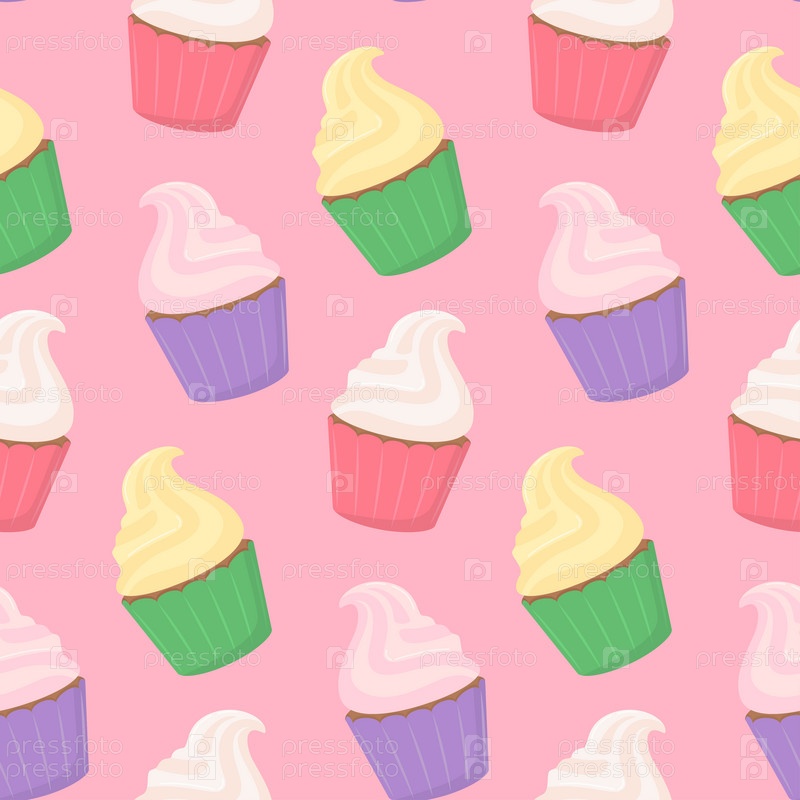 Бесшовный узор из сладких разноцветных вкусных кексов со сливками на светло-розовом фоне. Векторная иллюстрация десерта в плоском стиле