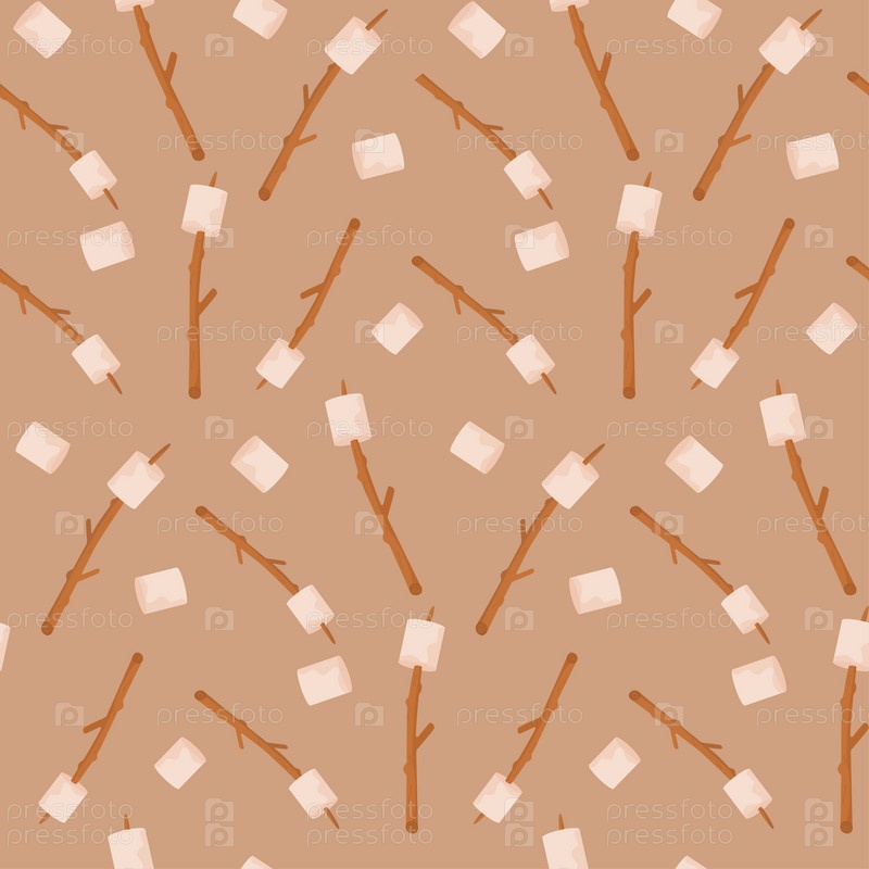 Бесшовный рисунок зефира на палочках для выпечки на костре. Пикник, походы, кемпинг, походы. Векторные иллюстрации в плоском стиле. Отдельный на белом фоне