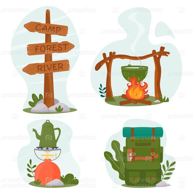 Горшок на костре в лесу. Деревянный указатель на летний лагерь, реку, лес. Походный рюкзак путешественника. Походная газовая плита с чайником