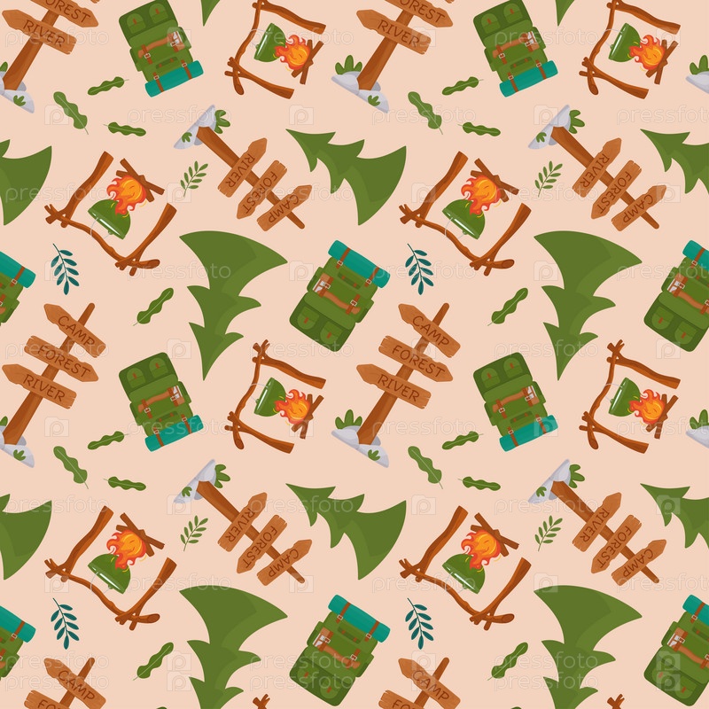 Бесшовный узор с костром, указателями, елью, походным рюкзаком. Фон для кемпинга, путешествий, поездок, пеших прогулок, природы, путешествий, пикника. Векторные иллюстрации в плоском стиле