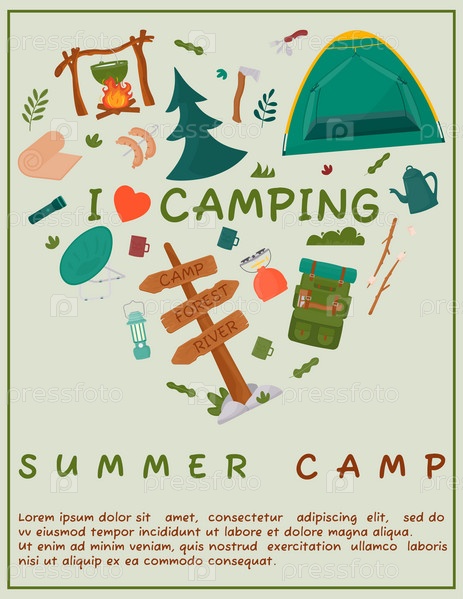 Плакат А4 для летнего кемпинга, путешествий, поездок, походов, туристов, природы, путешествий, пикников. Дизайн плаката, баннера, листовки, обложки, специального предложения, рекламы. Векторные иллюстрации в плоском стиле