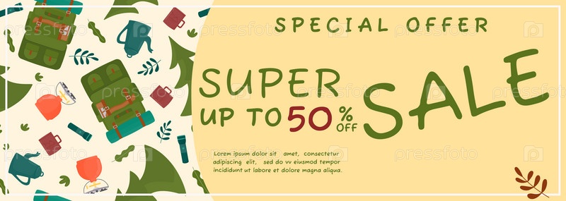 Рекламный баннер с изображением кемпинга. Летний кемпинг, путешествия, поездки, походы, туристы, природа, путешествия, концепция пикника. Векторная иллюстрация для плаката, баннера, листовки, обложки