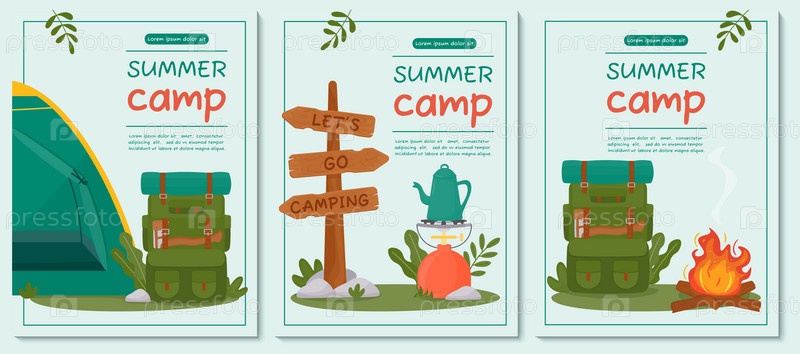Набор плакатов для летнего кемпинга, путешествий, поездок, походов, туристов, природы, путешествий, пикников. Дизайн плаката, баннера, листовки, обложки, специального предложения, специального предложения. Векторная иллюстрация
