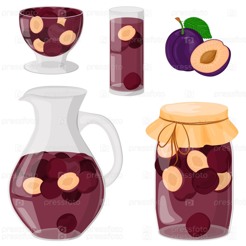 Компот из сливы в стеклянном графине, стакане, банке. Пью из домашних фруктов. Домашнее варенье или желе в стеклянной миске. Концепция здорового питания. Векторные иллюстрации в плоском стиле