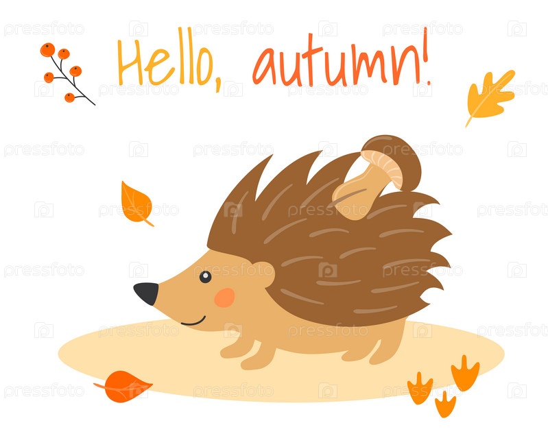 Векторная иллюстрация с милым ежиком и грибом в мультяшном стиле. Лесные животные и растения. Привет, осень
