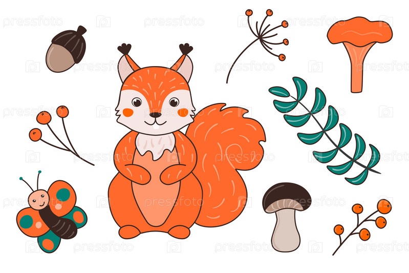 Векторная иллюстрация с милой белкой, бабочкой, веточками, осенними листьями и грибами в мультяшном стиле. Лесные животные и растения
