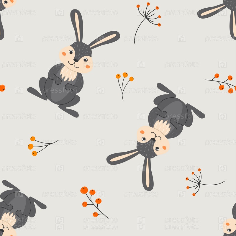 Бесшовный узор с милым кроликом и веточками в мультяшном стиле. Животные в лесу. Векторная иллюстрация
