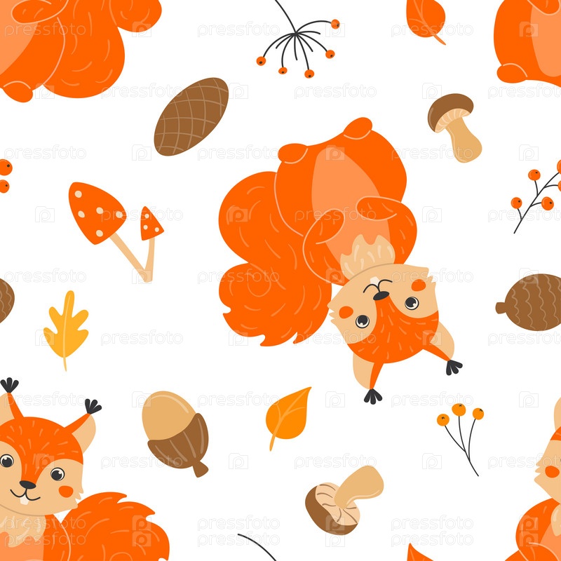 Бесшовный узор с милыми белками, шишками, грибами, желудями и веточками с ягодами в мультяшном стиле. Животные и растения в лесу. Векторная иллюстрация