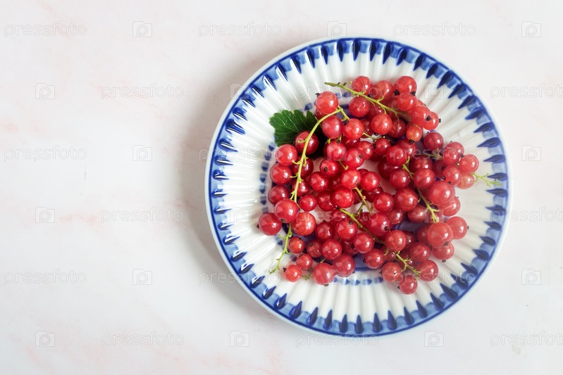 Ягоды красной смородины на блюдце с синей каймой