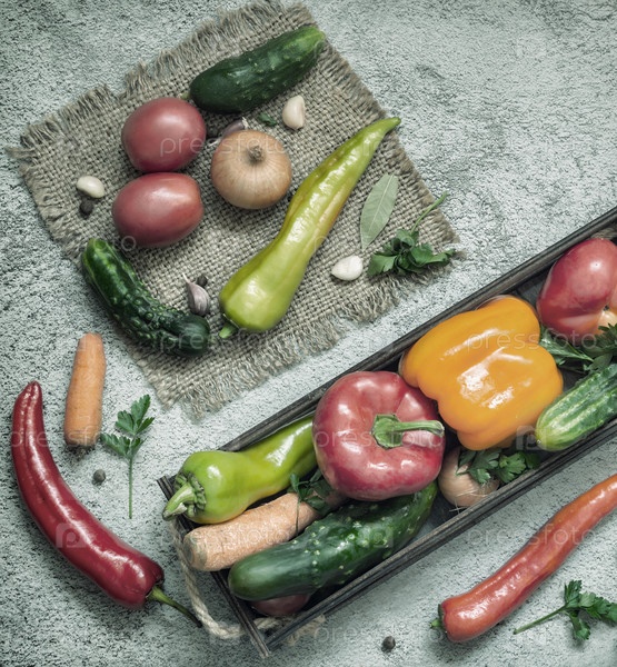 В деревянном контейнере и на салфетке разнообразные спелые овощи: помидоры, перец, огурцы, петрушка, кабачки. Вид сверху . Плоская планировка