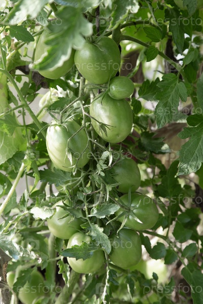 Зеленые помидоры созревают в теплице на ветвях растения