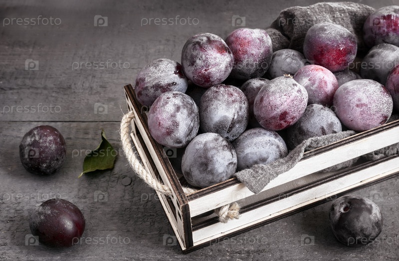 Большие спелые сливы в контейнере на столе