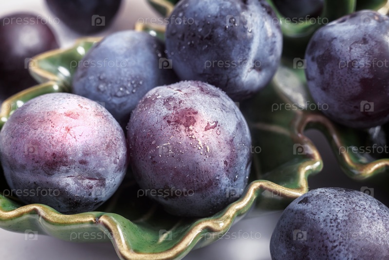 Большие спелые сливы в зеленой керамической посуде