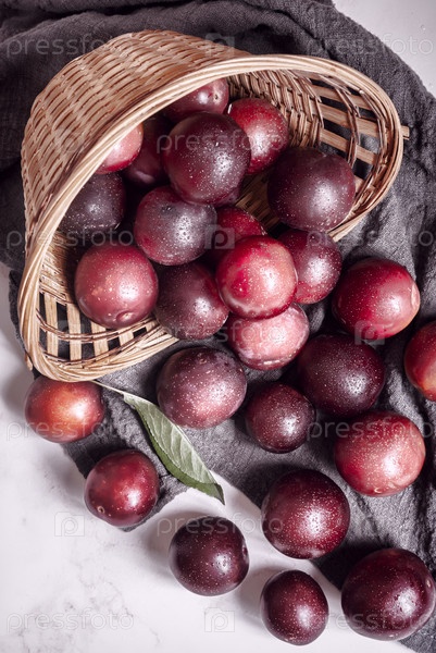 Большие спелые сливы высыпались из опрокинутой плетеной корзины на салфетку на столе