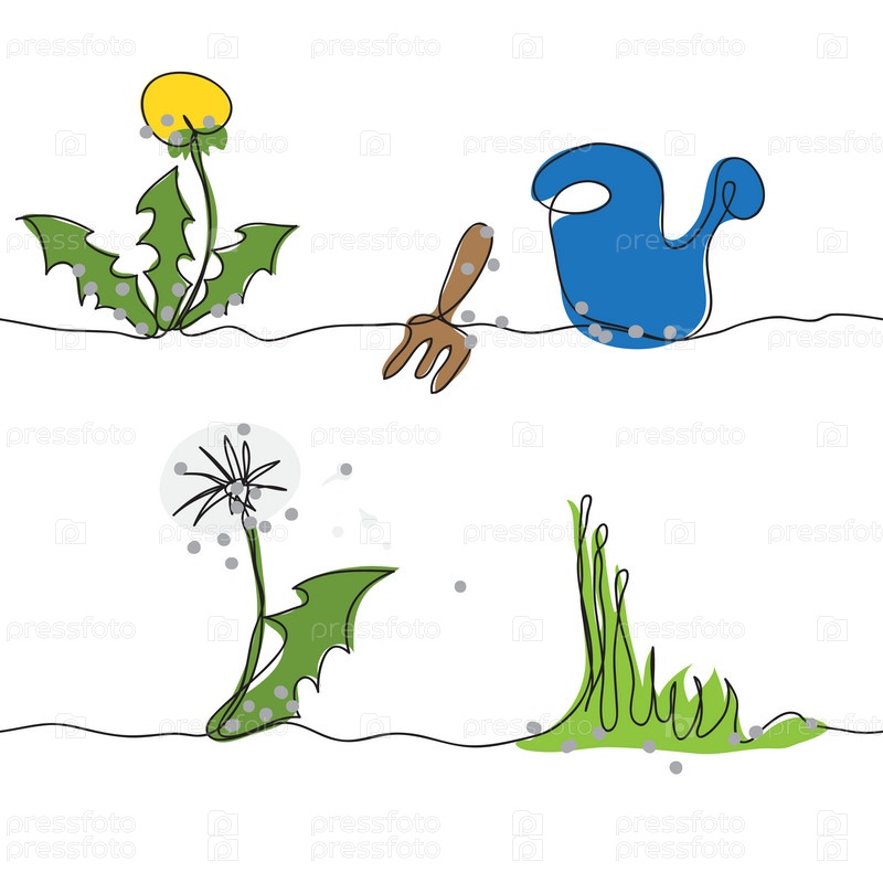 Бесшовный фон из одуванчиков и садовых инструментов. Рука рисует непрерывную линию