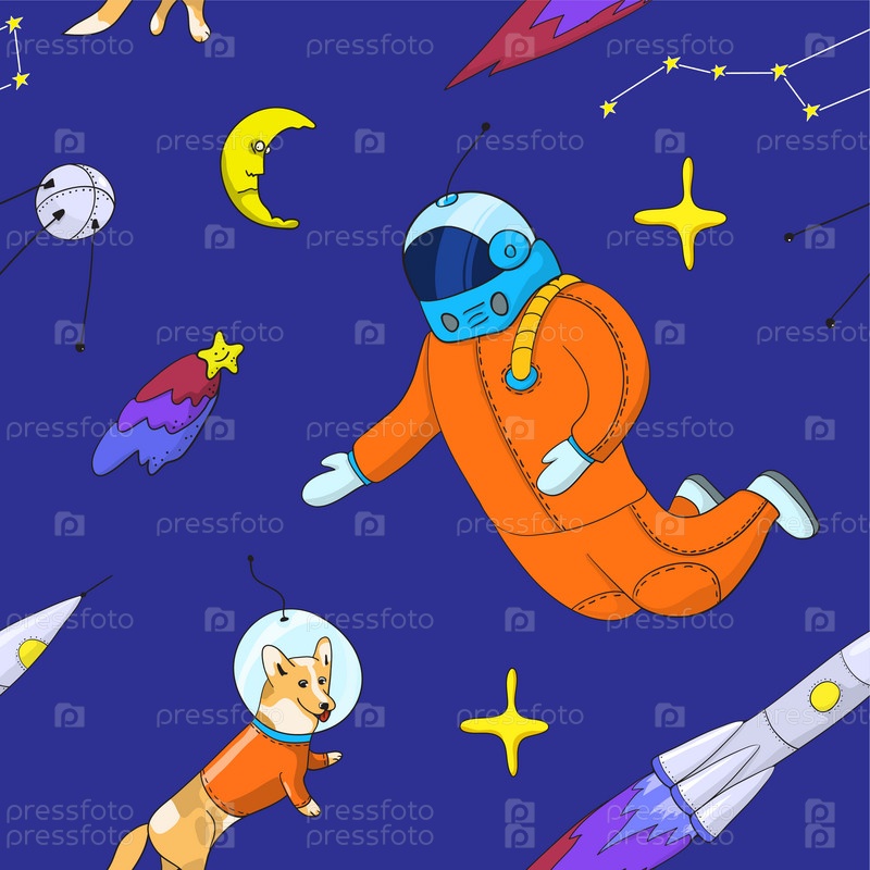 Бесшовный фон с космическими объектами - космонавт, собака в скафандре, спутник, комета, луна, звезды, созвездия
