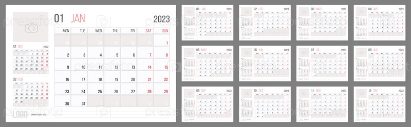 Набор корпоративных шаблонов планировщика календаря 2023. Неделя начинается в понедельник