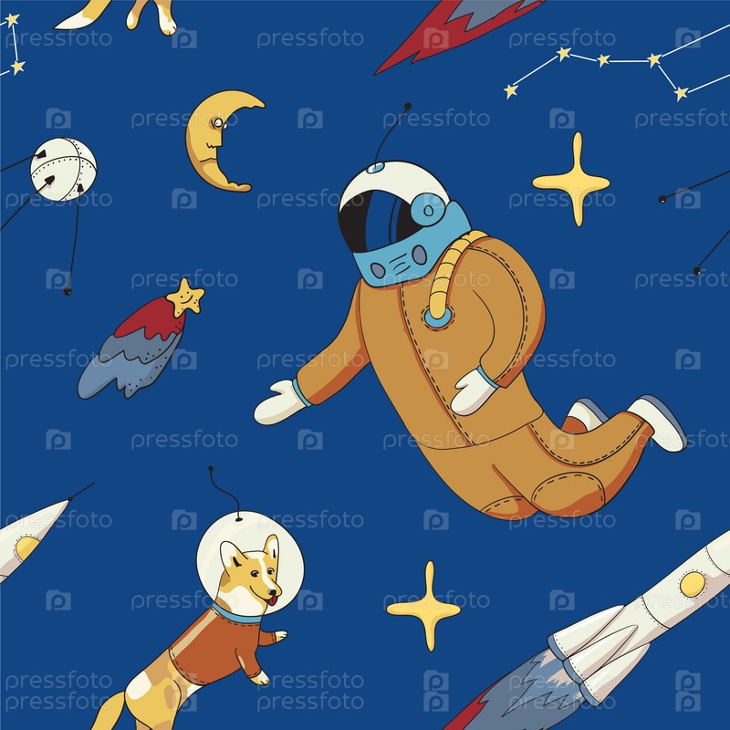Бесшовный фон с космическими объектами - космонавт, собака в скафандре, спутник