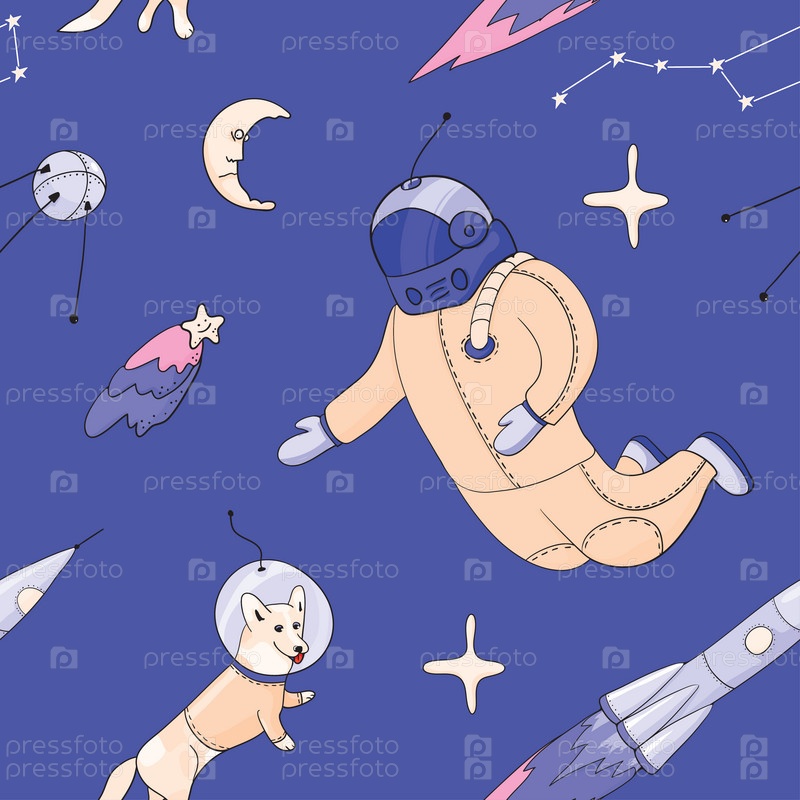 Бесшовный фон с космическими объектами - космонавт, спутник, комета, луна, звезды, созвездия