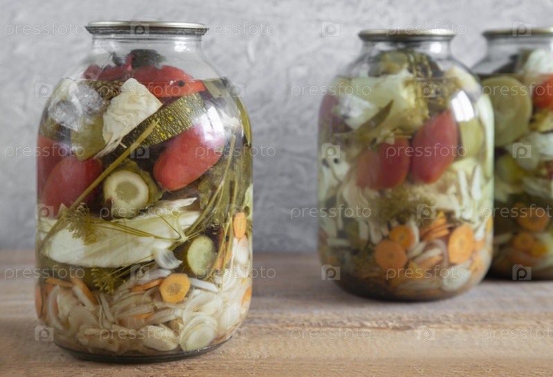 В стеклянных банках консервируют различные виды овощей: огурцы, помидоры, капусту, лук, морковь, кабачки. Вид спереди, крупный план