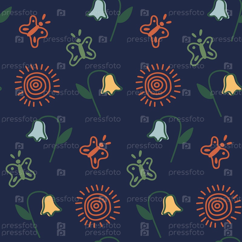 Бесшовный узор с цветами, солнцем и бабочками на синем фоне