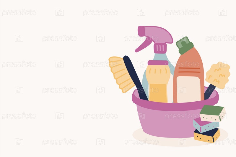 Площадка с чистящими средствами - тазиком, санитарными средствами, щеткой, ершиком для унитаза, чистящими губками