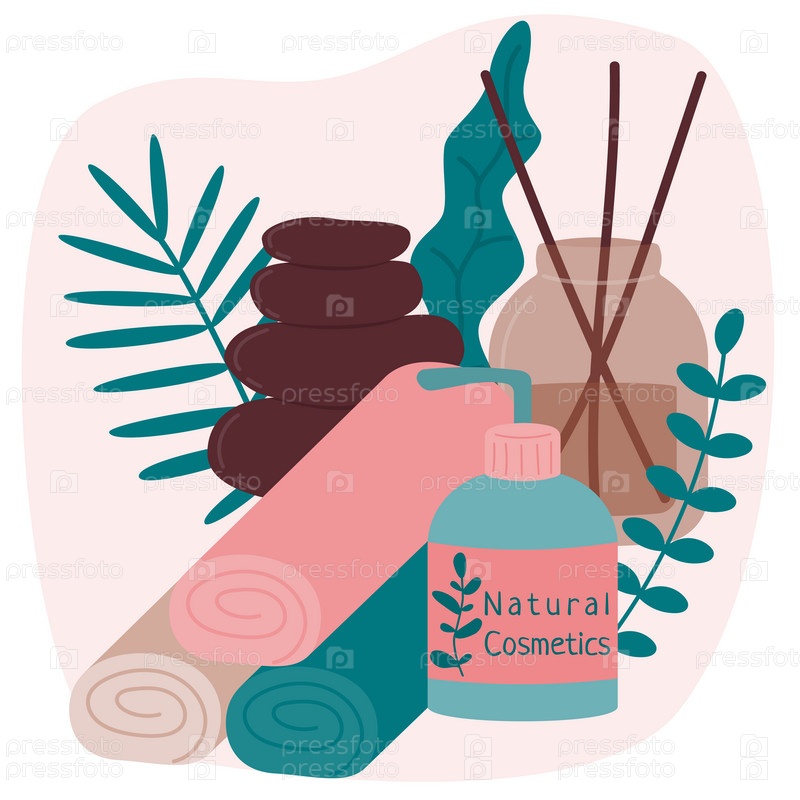 Композиция для спа и оздоровительного салона представляет собой стеклянную бутылку с ароматическими палочками, полотенца, баночку с дозатором, камни и растения