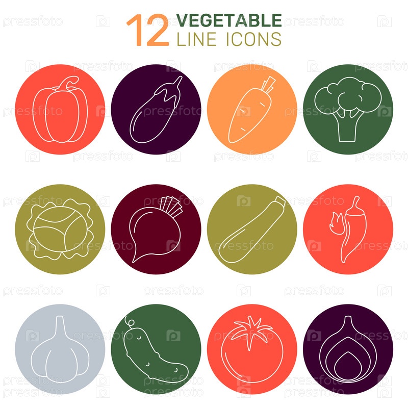 Набор векторных иконок овощей - помидор, огурец, перец, лук, чеснок, брокколи, капуста, кабачки, баклажаны, острый перец, морковь, свекла. Коллекция иконок контуров