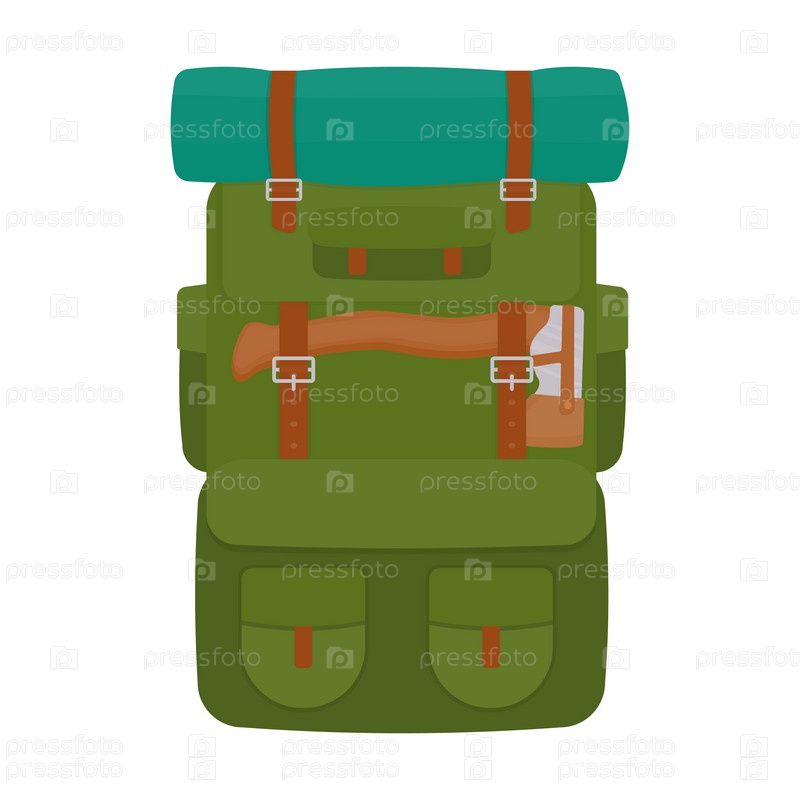 Походный рюкзак путешественника. Туристический рюкзак для походов, туристическое снаряжение для приключений. Векторные иллюстрации в плоском стиле. Отдельный на белом фоне