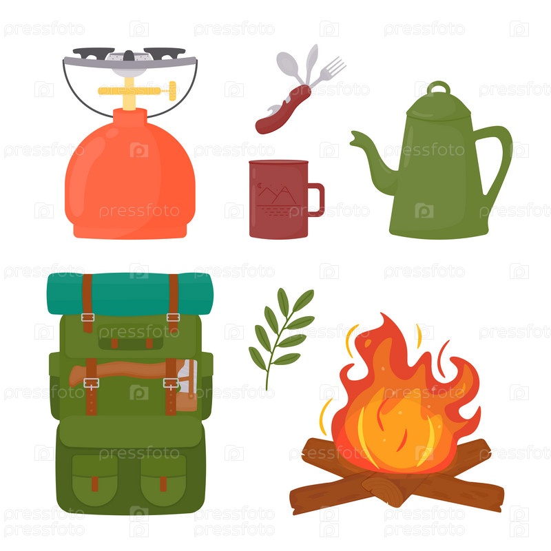 Горелка. Портативный набор столовых приборов - нож, ложка, вилка, открывалка. Кофейный чайник. Чашка. Костер. Вектор