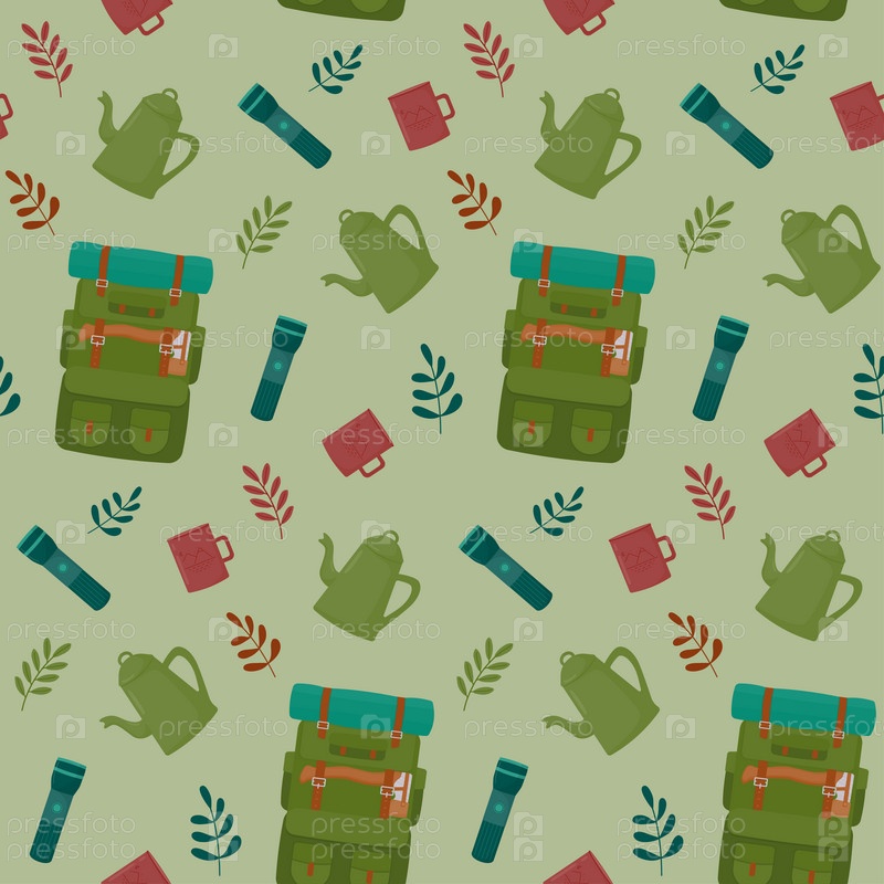 Бесшовный узор с походными кружками, чайником, рюкзаком, фонариком и растениями. Кемпинговое снаряжение для приключений. Векторные иллюстрации в плоском стиле