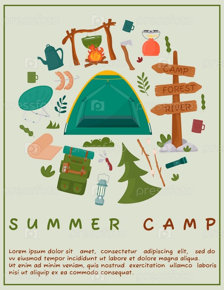 Плакат А4 для летнего кемпинга, путешествий, поездок, походов, туристов, природы, путешествий, пикников. Дизайн плаката, баннера, листовки, обложки, специального предложения, рекламы. Векторные иллюстрации в плоском стиле