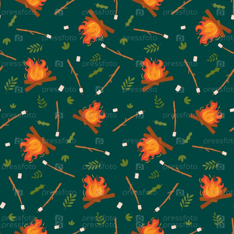 Бесшовный узор с кострами и зефиром. Костер. Пылающее красно-желтое пламя. Конфеты на палочках для запекания на огне. Векторные иллюстрации в плоском стиле