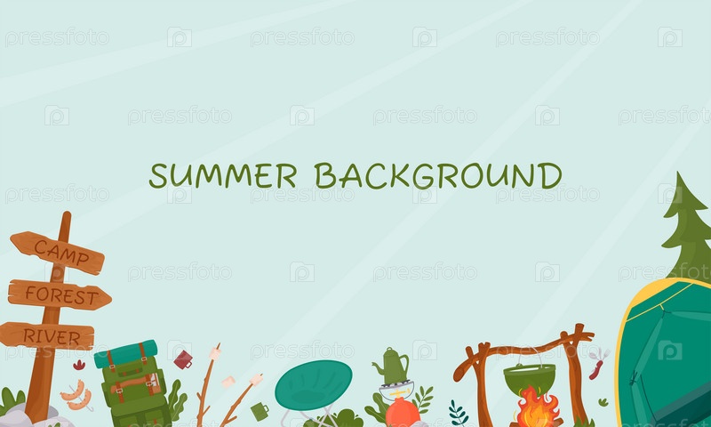 Фон для летнего кемпинга, путешествий, поездок, пеших прогулок, туристов, природы, путешествий, пикников. Дизайн плаката, баннера, листовки, обложки, специального предложения, рекламы. Векторные иллюстрации в плоском стиле