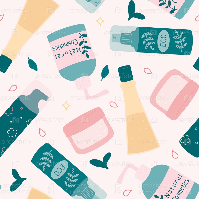 Бесшовный рисунок флаконов, стеклянных банок, трубок. Коллекция травяной косметики. Натуральные средства по уходу за лицом. Векторные иллюстрации в плоском стиле