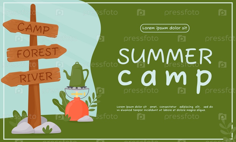 Фон для летнего кемпинга, путешествий, поездок, пеших прогулок, туристов, природы, путешествий, пикников. Дизайн плаката, баннера, листовки, обложки, специального предложения, рекламы. Векторные иллюстрации в плоском стиле