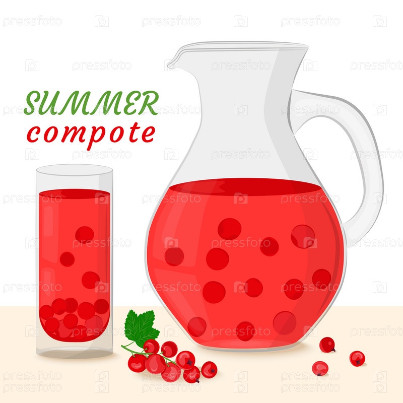 Компот из красной смородины в стеклянном графине и стакане. Пью из домашних фруктов. Ягоды для полезного летнего напитка. Векторные иллюстрации в плоском стиле
