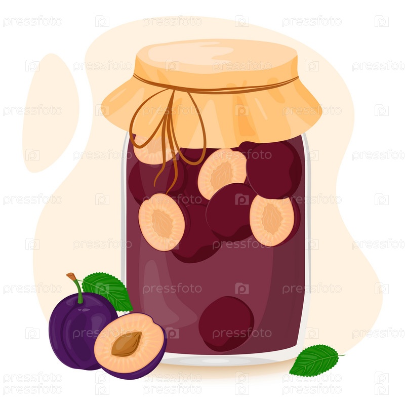 Сливовый компот, варенье или желе в стеклянной банке. Консервированные фрукты. Ягоды для полезного летнего напитка. Сохранение для будущего использования. Векторная иллюстрация меню, дизайн упаковки в плоском стиле