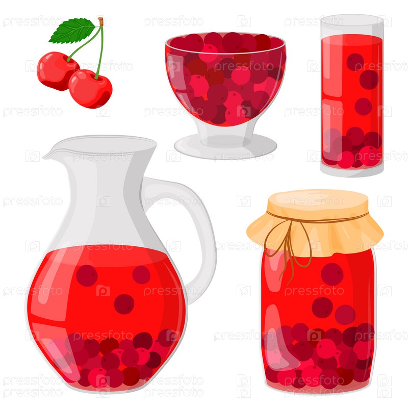 Вишневый компот в стеклянном графине, стакане, банке. Пью из домашних фруктов. Домашнее варенье или желе в стеклянной миске. Концепция здорового питания. Векторные иллюстрации в плоском стиле
