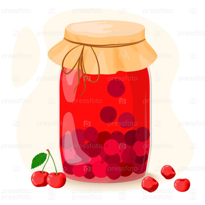 Вишневый компот в стеклянном графине. Пью из домашних фруктов. Ягоды для полезного летнего напитка. Векторные иллюстрации в плоском стиле