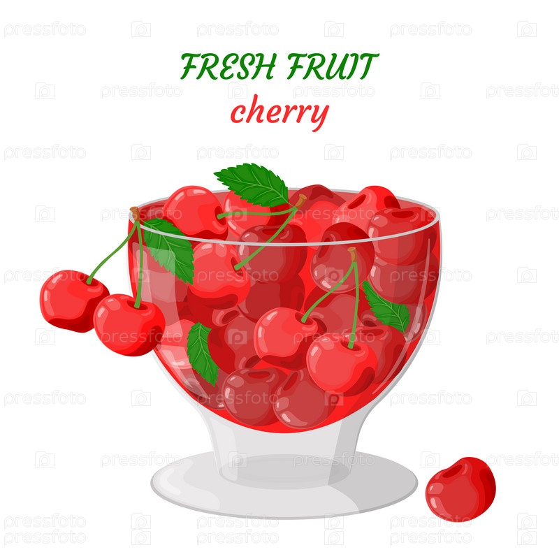 Ягоды вишни с зелеными листьями в стеклянной таре. Концепция здорового питания. Спелые ягоды. Сбор фруктов. Векторные иллюстрации в плоском стиле