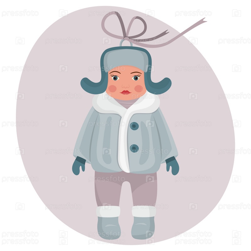Елочная игрушка – мальчик в шапке, теплой шубе и валенках. Украшение елки в стиле ретро. Концепция зимних праздников и торжеств. Векторная иллюстрация
