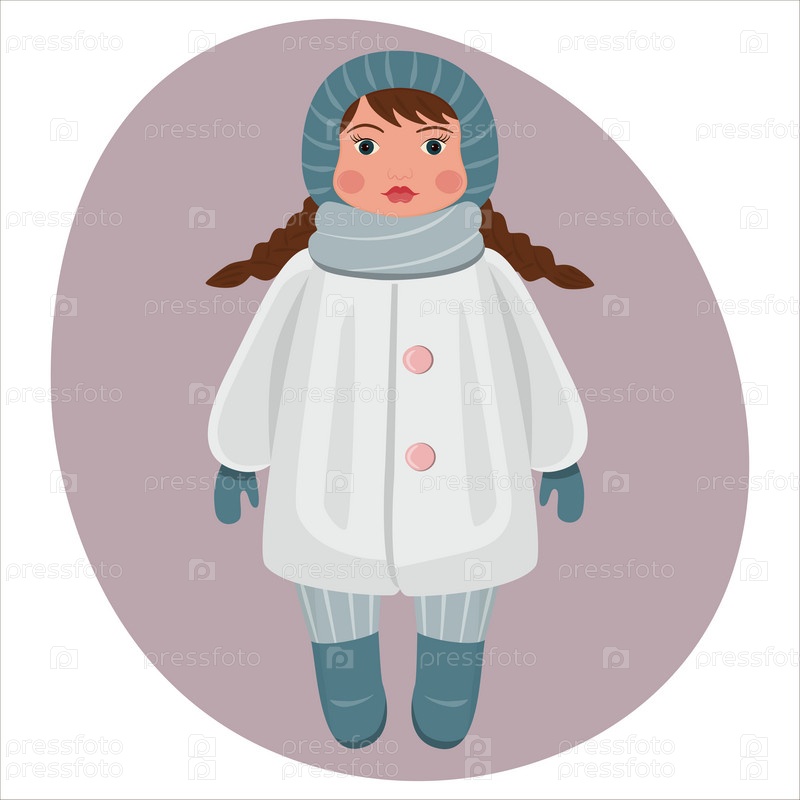 Кукла с косичками в теплой шубе, шапке и валенках. Игрушка в стиле ретро. Маленькая девочка в зимней одежде. Векторная иллюстрация