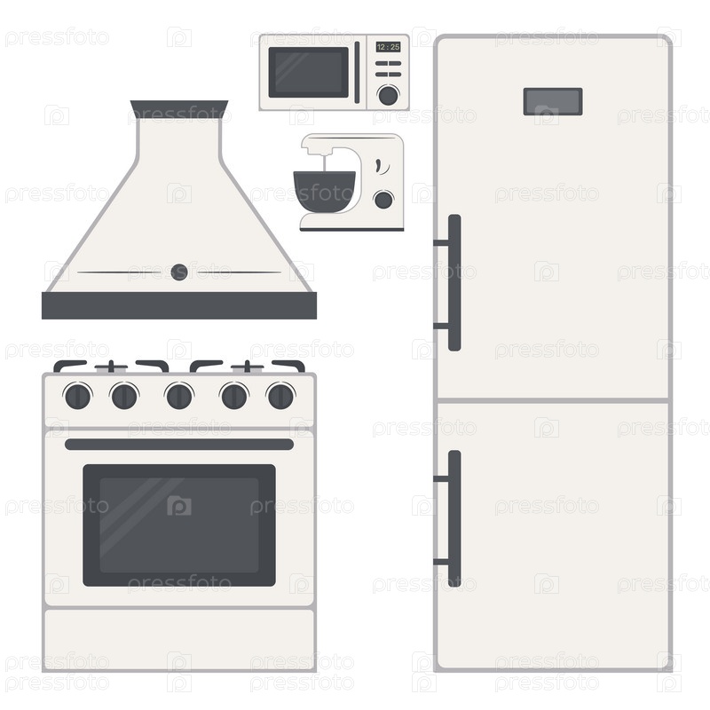 Набор элементов для оформления интерьера кухни с мебелью: холодильник, газовая плита, вытяжка, микроволновая печь, миксер
