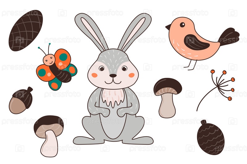 Векторная иллюстрация с милым кроликом, птицей, бабочкой, грибами, конусом, желудем, веточкой в мультяшном стиле. Лесные животные и растения