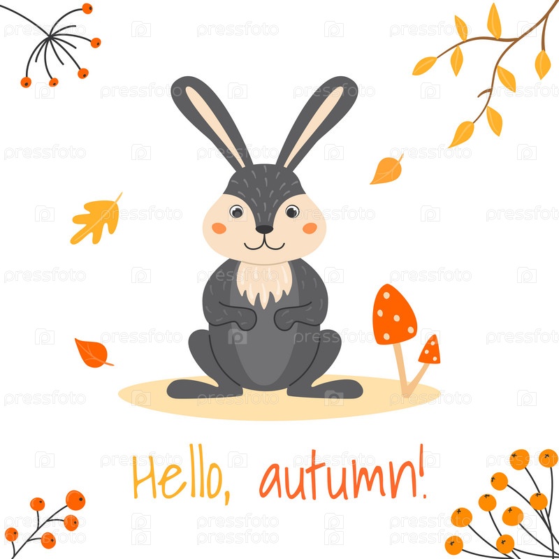 Векторная иллюстрация с милым кроликом и грибом в мультяшном стиле. Лесные животные и растения. Привет осень