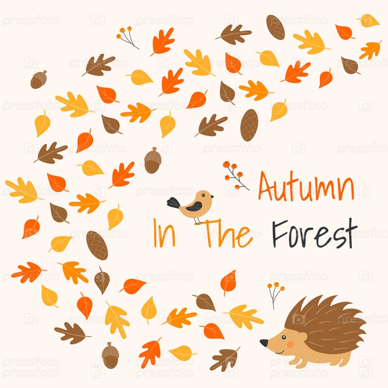 Векторная иллюстрация с милым ежиком, птицей и листопадом в мультяшном стиле. Лесные животные и растения. Осень в лесу