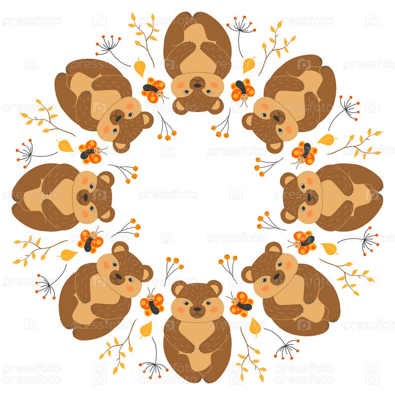 Векторная круглая рамка с милыми медведями, бабочками, ветками и листьями в мультяшном стиле. Лесные животные и растения. Осень в лесу. Место для текста